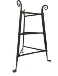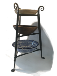 Hand wrought stand displays pies, cakes and desserts on a table top in style.