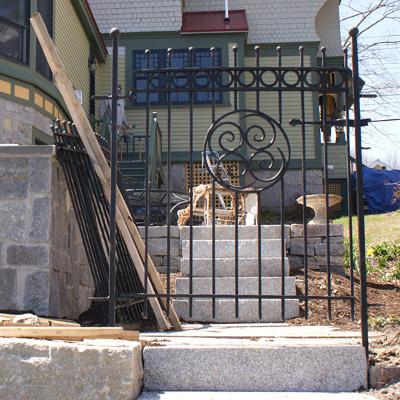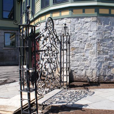 Custom gate has a sliding closure and rocks wrapped in iron.